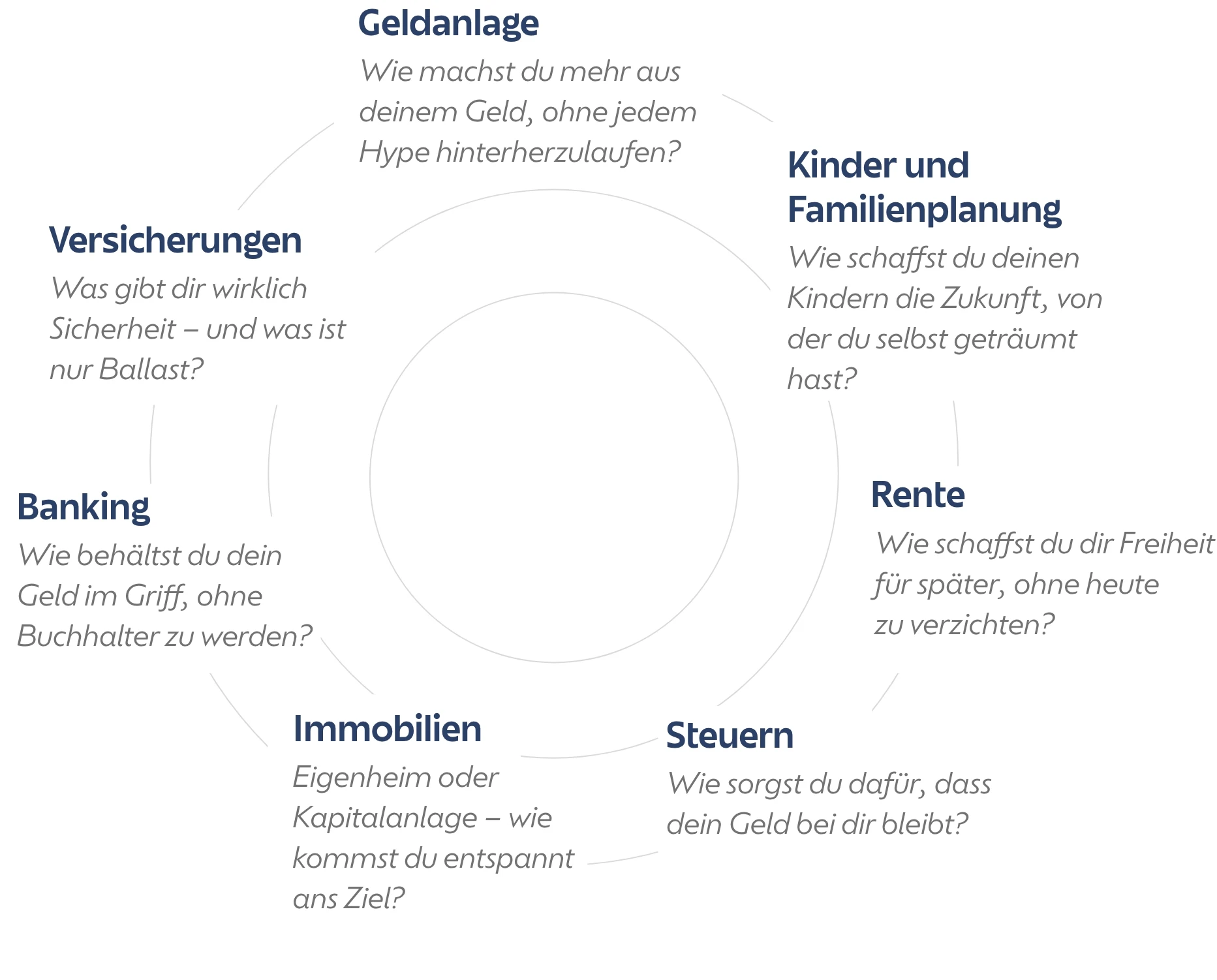 Vom ersten Job bis zum großen Projekt wächst dein Plan mit deinen Zielen. Ob Wohnen, Absicherung, Investieren, Altersvorsorge, Banking oder Steuern – alles, was wichtig ist, steckt drin. Keine Standardlösungen, sondern etwas, das zu dir passt. So hast du mehr Zeit für das, was dich antreibt.